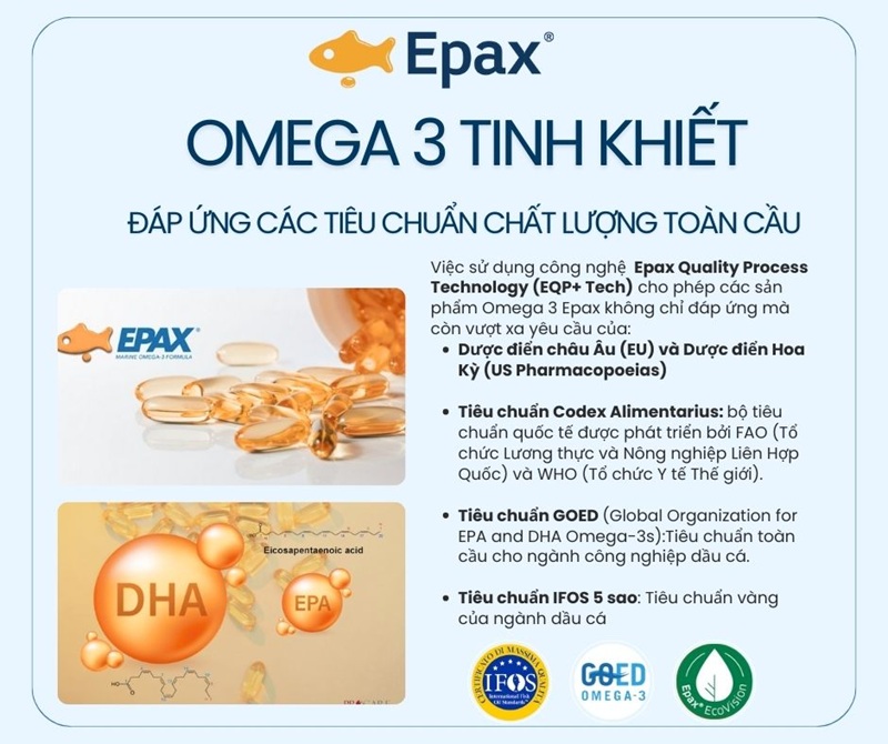- Độ Tinh Khiết Vượt Chuẩn Ngành: Epax hoạt động với 3 nguyên tắc cốt lõi: Tinh khiết, Chất lượng và Đổi mới. Sản phẩm không chỉ đáp ứng mà còn vượt xa các yêu cầu của: IFOS 5 sao (Tiêu chuẩn vàng về độ sạch, tinh khiết), GOED (Tiêu chuẩn toàn cầu cho ngành dầu cá), Codex Alimentarius, và các Dược điển hàng đầu thế giới (EU/US Pharmacopoeias).