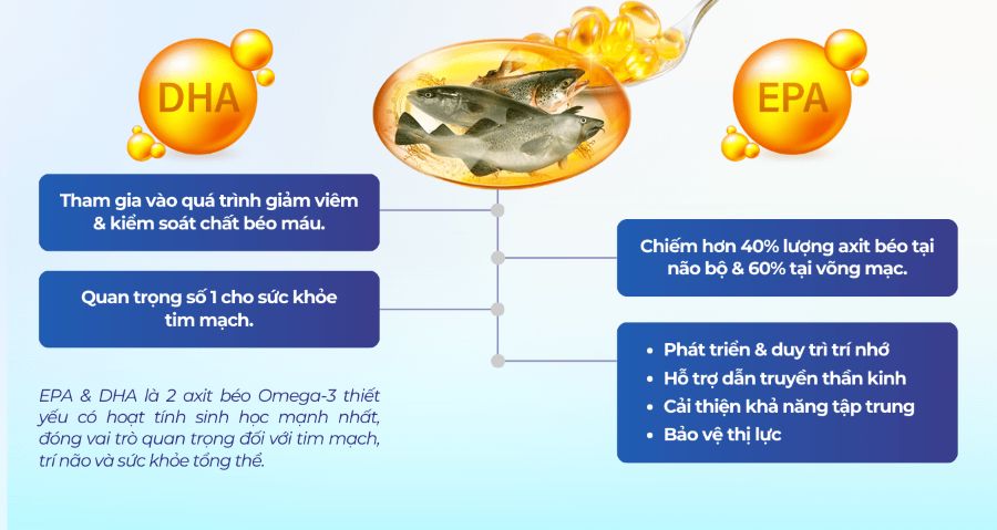 EPA đặc biệt nổi bật nhờ khả năng tham gia vào quá trình tạo ra các chất chống viêm tự nhiên của cơ thể (prostaglandins nhóm 3). Nhờ đó, EPA giúp giảm viêm mạn tính, cải thiện tuần hoàn máu, giảm nguy cơ hình thành cục máu đông và hỗ trợ duy trì sức khỏe tim mạch.