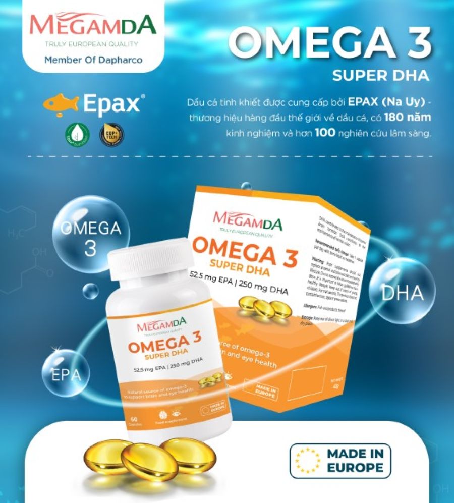Megamda Omega-3 Super DHA là thực phẩm bảo vệ sức khỏe cao cấp được phát triển bởi DAPHARCO - đơn vị TOP 10 công ty dược uy tín Việt Nam với hơn 50 năm kinh nghiệm. Sản phẩm được sản xuất tại Goerlich Pharma (Đức) theo tiêu chuẩn GMP châu Âu, sử dụng nguyên liệu dầu cá tinh khiết EPAX từ Na Uy - thương hiệu hàng đầu thế giới về Omega-3.