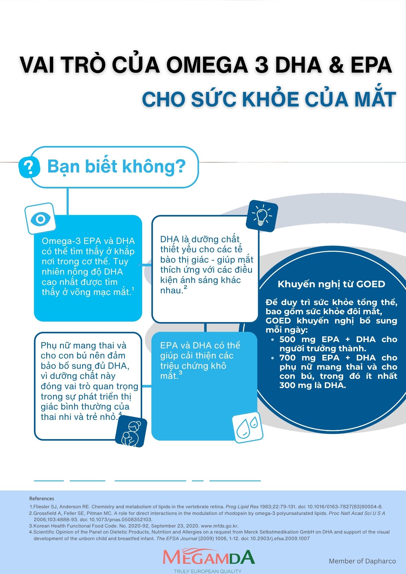 - Người trưởng thành nên bổ sung 500 mg EPA + DHA/ngày để duy trì sức khỏe tổng thể, bao gồm cả sức khỏe đôi mắt.